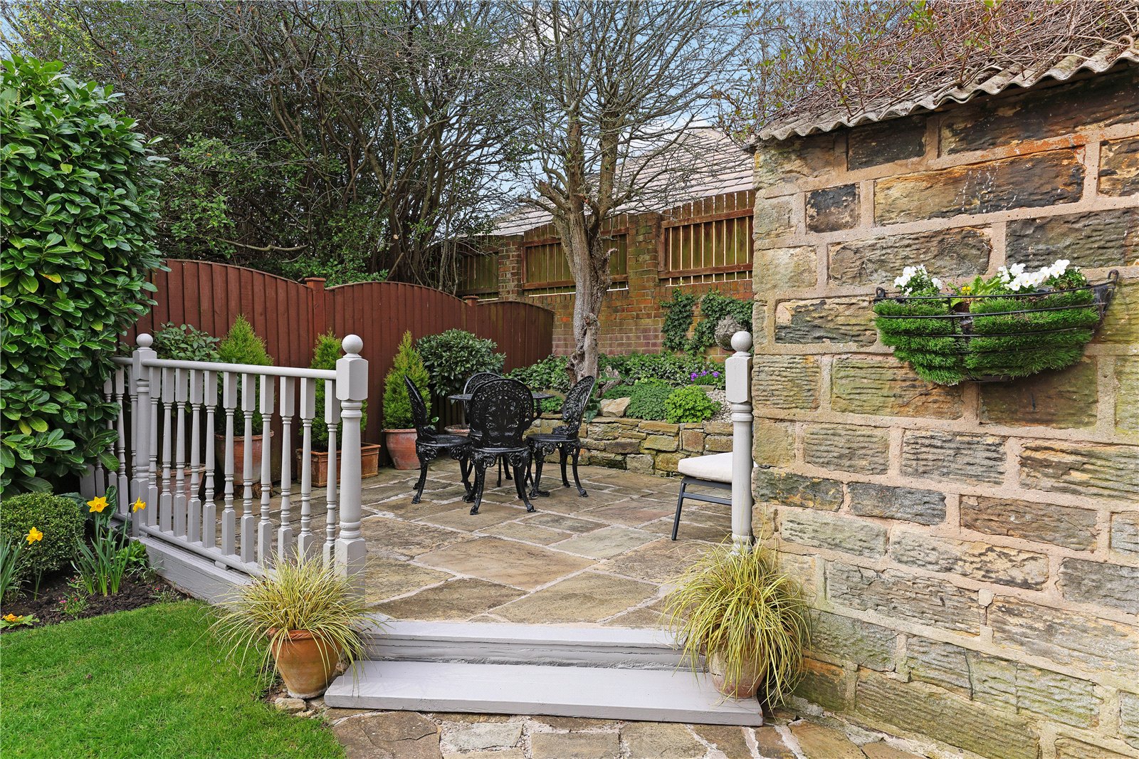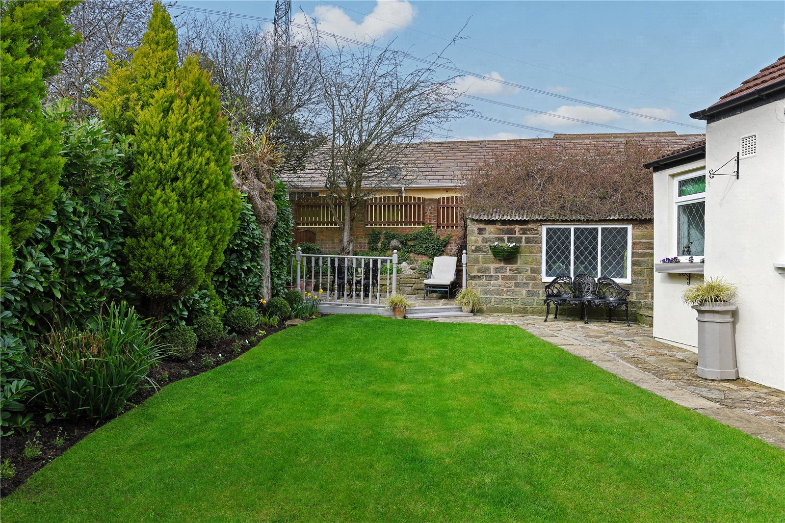 The property is set well back from the back road with neat lawn gardens to the front with mature, Monkey Puzzle tree, paved driveway provides ample off street parking with adjacent raised flower beds with mature trees and shrubs leading to detached garage. To the rear, neat lawn garden with mature evergreen shrubs retaining a high degree of privacy with stone paved patio area.