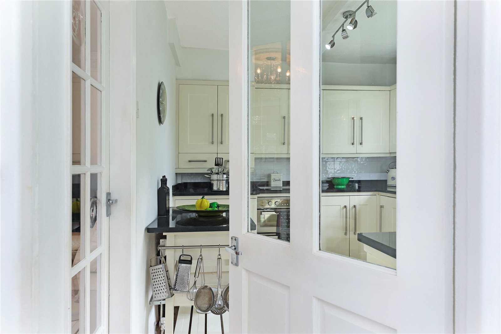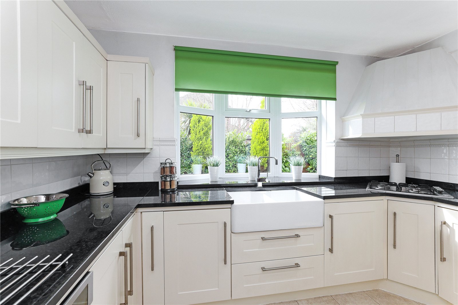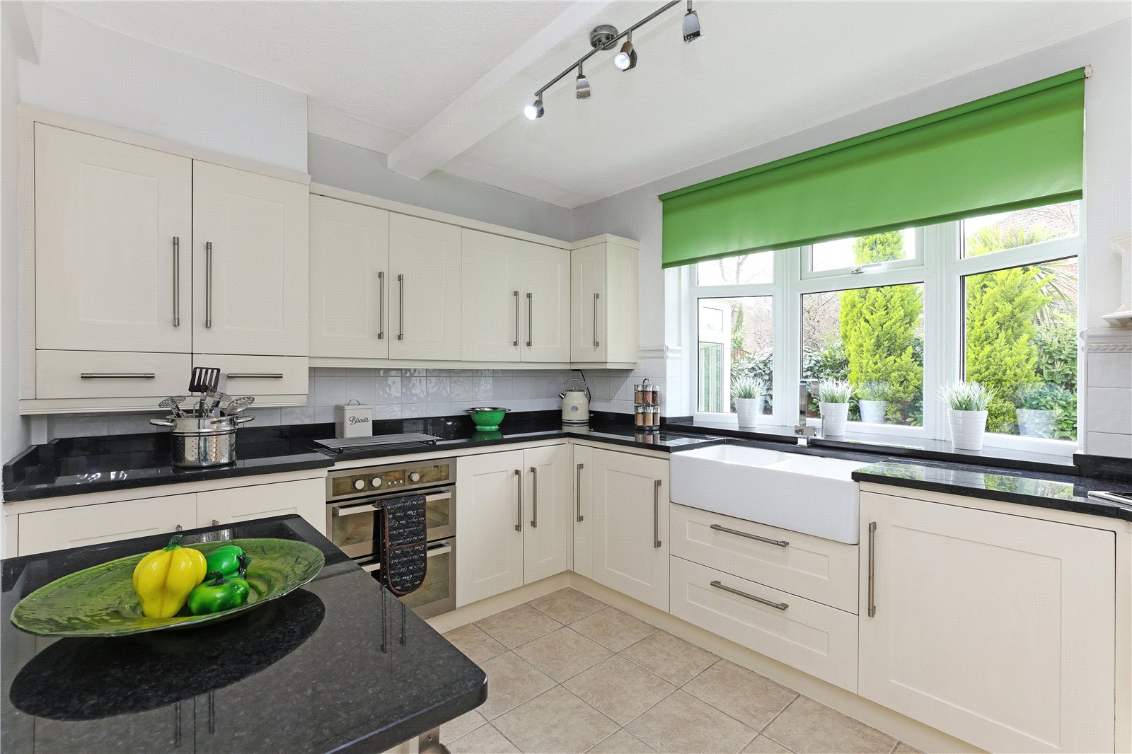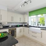 Fitted with a matching range of cream shaker style fronted wall and base units, contrasting granite worktops with feature double Belfast sink with mixer tap unit, built in double oven, gas hob with extractor hood over, integrated fridge, central heating boiler, tiling between the worktops and wall units, double glazed bow window overlooking the rear garden, double panel radiator.