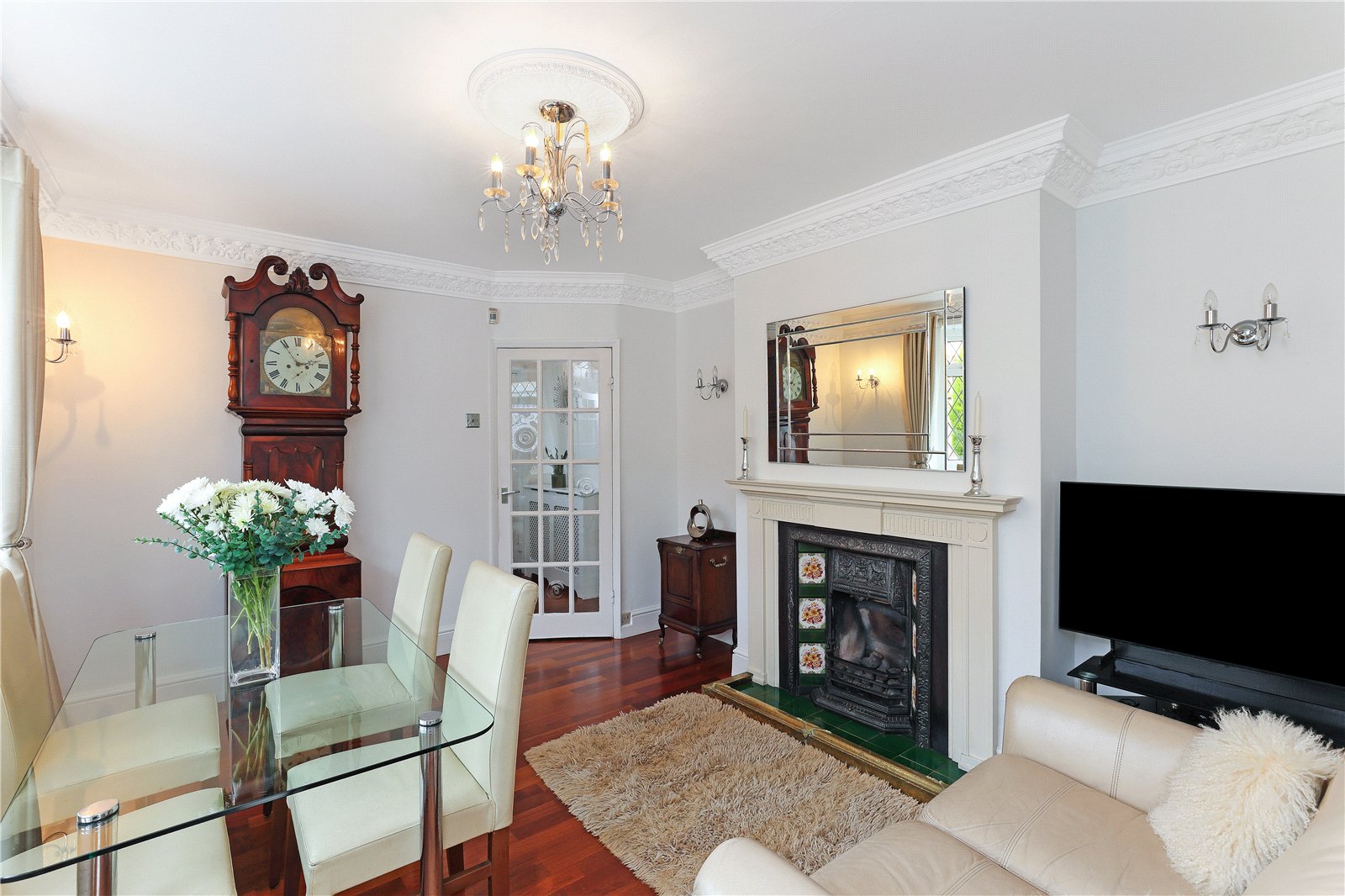 With feature Adam style fire surround with cast iron inset, open grate, tiled hearth, two wall light points, double glazed bow window to the front, dado rail, single panel radiator, double doors opening to...