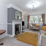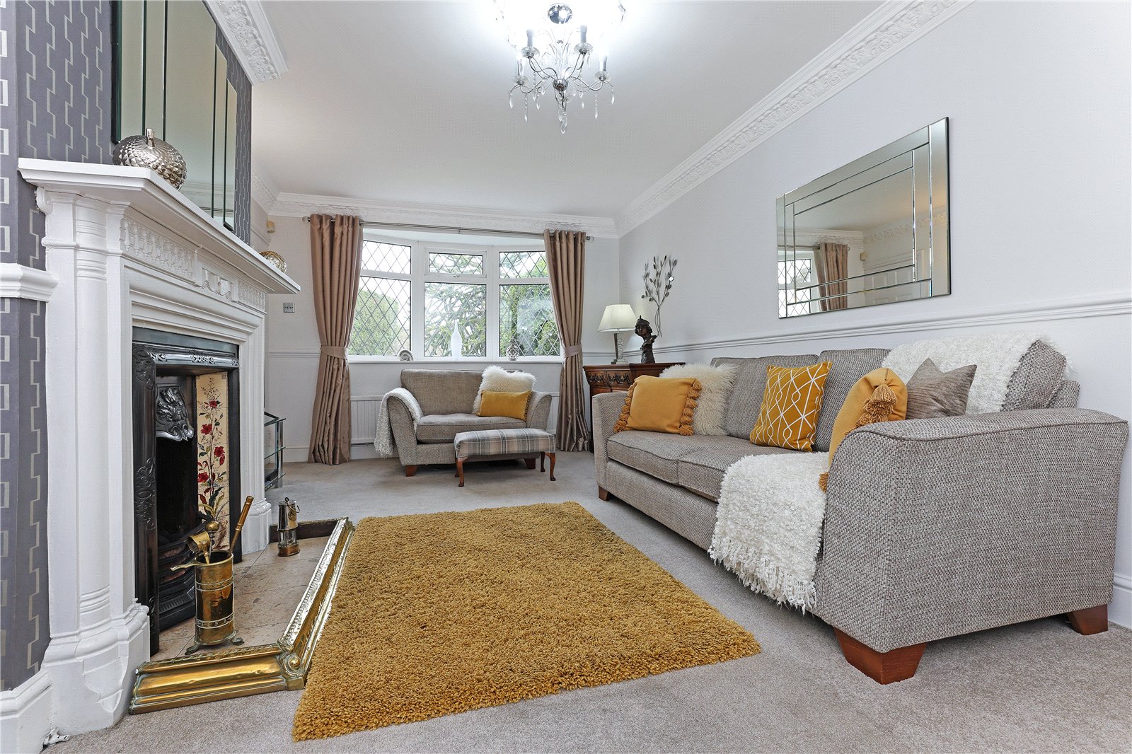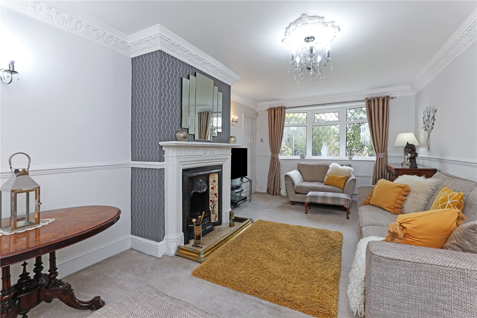 Having feature fire surround with cast iron inset and tiled, with fitted flame effect gas fire, four wall light points, double glazed feature bow window to the side, single panel radiator.