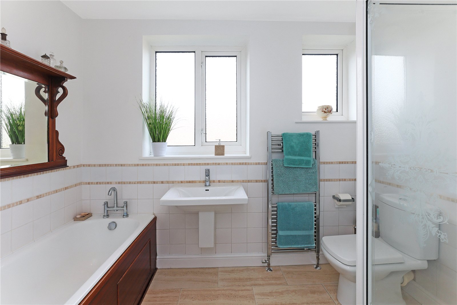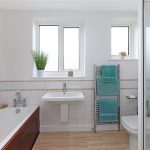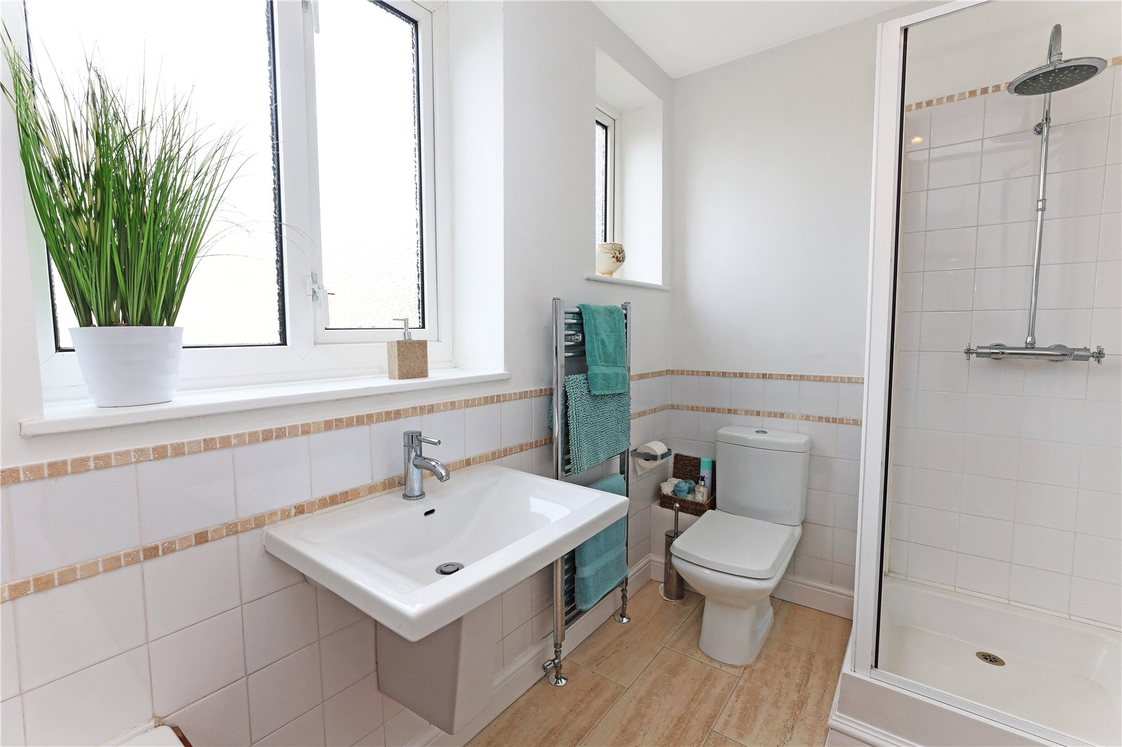 Furnished with modern white suite with wash hand basin, low flush w/c, panelled bath, separate shower cubicle, tiling, chrome heated towel rail, double glazed window.
